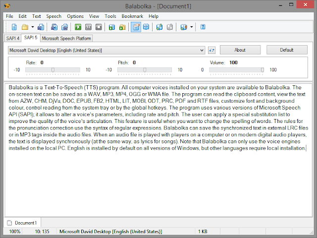 The program uses various versions of Microsoft Speech API (SAPI); it allows to alter a voice's parameters, including rate and pitch. The user can apply a special substitution list to improve the quality of the voice's articulation. This feature is useful when you want to change the spelling of words. The rules for the pronunciation correction use the syntax of regular expressions. Balabolka can save the synchronized text in external LRC files or in MP3 tags inside the audio files. When an audio file is played with players on a computer or on modern digital audio players, the text is displayed synchronously (at the same way, as lyrics for songs).